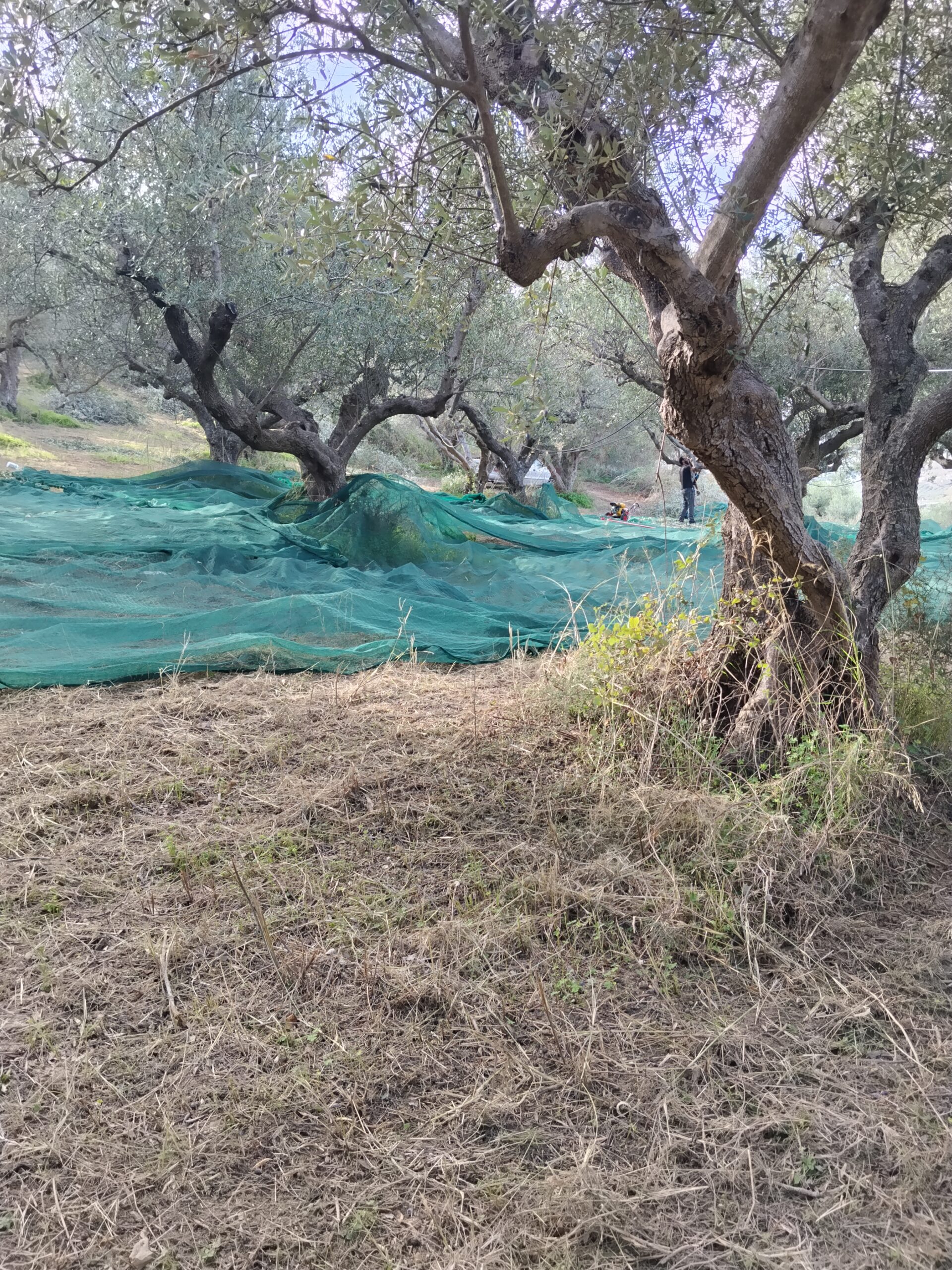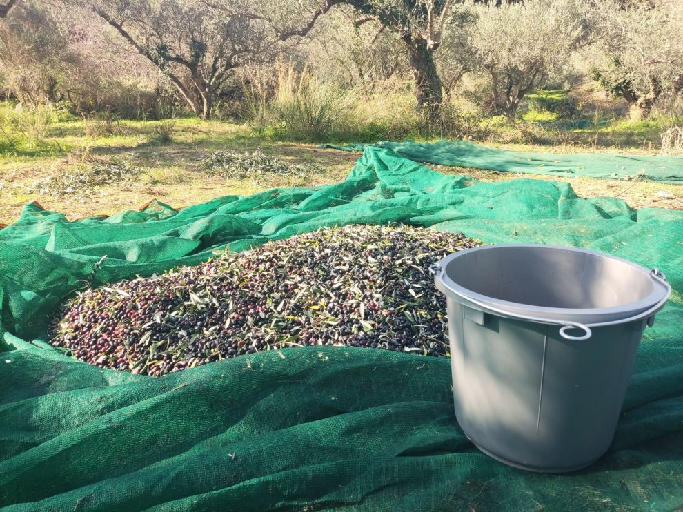 Φτάνουμε στο χωριό, η δουλειά ξεκινάει. Παίρνουμε τις γεννήτριες από την αποθήκη, κατεβαίνουμε στο χωράφι όπου είναι απλωμένα τα λιόπανα από την προηγούμενη μέρα, ψεκάζουμε με λιπαντικό τις βέργες των ραβδιών, φοράμε γάντια και γυαλιά. Τρεις στα ραβδιά, δύο στα πανιά και στο καθάρισμα. Το έδαφος έχει κλίση, τα πανιά κατά τόπους αιωρούνται πάνω στα ψηλά χόρτα και οι πατημασιές κοντά στους κορμούς ακολουθούνται από δυνατά «ωχ», που σημαίνει ότι γύρω από τις ελιές υπάρχουν αγκάθια. Πρώτο διάλειμμα για καφέ και δεκατιανό, τηλεφωνήματα για κάποιους, TikTok για κάποιους άλλους, συνέχεια με ράβδισμα και μάζεμα. Δεύτερο διάλειμμα για μεσημεριανό και ξανά δουλειά μέχρι το σχόλασμα. Αυτή η τελετουργία επαναλαμβάνεται καθημερινά.
