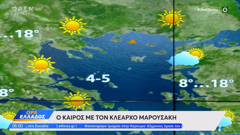 Αρχικά, για σήμερα, Πέμπτη, ο καιρός θα είναι αίθριος, με την ηλιοφάνεια να κυριαρχεί στα περισσότερα γεωγραφικά διαμερίσματα. Συννεφιές θα υπάρχουν προς τα δυτικά και τα νησιά του νοτιοανατολικού Αιγαίου, οι οποίες δεν αποκλείεται να συνοδευτούν από λίγες πρόσκαιρες τοπικές βροχές. Οι άνεμοι θα πνέουν από νότιες διευθύνσεις, με μέτριες και τοπικά ισχυρές εντάσεις και η θερμοκρασία θα φτάσει έως τους 17 και τοπικά 19 βαθμούς Κελσίου.