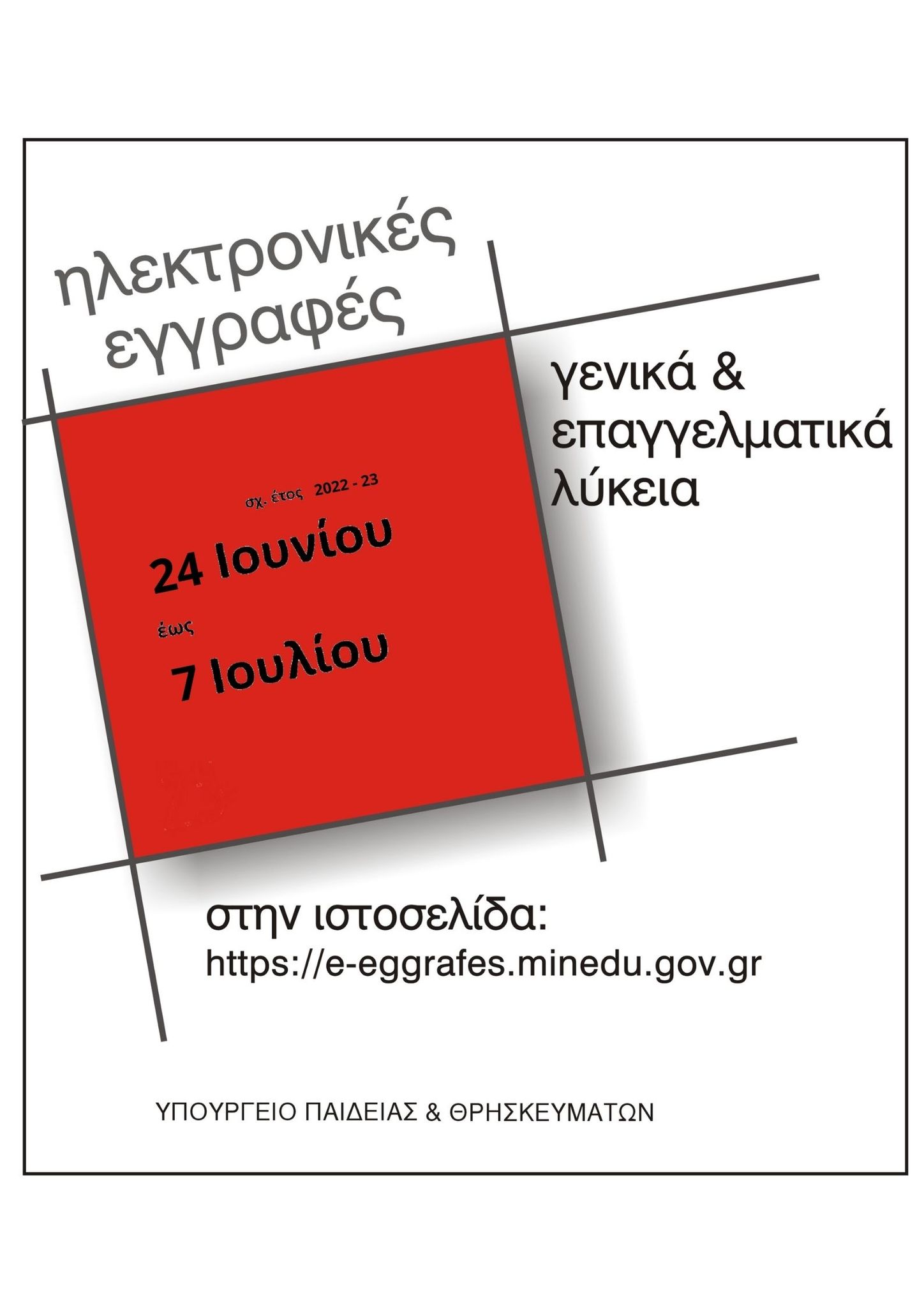 Ξεκίνησαν στις 24 Ιουνίου και ολοκληρώνονται στις 7 Ιουλίου 2022 οι ηλεκτρονικές αιτήσεις εγγραφών/μετεγγραφών μαθητών /-τριών σε ΕΠΑ.Λ. και ΓΕ.Λ. για το σχολικό έτος 2021-2022. Οι αιτήσεις υποβάλλονται στην ηλεκτρονική διεύθυνση https://e-eggrafes.minedu.gov.grή μέσω της διαδικτυακής πύλης https://www.gov.gr/ipiresies/ekpaideuse/eggraphe-se-skholeio/eggraphe-ananeose-eggraphes-se-geniko-kai-epaggelmatiko-lukeio από τον κηδεμόνα που έχει δηλωθεί στο πληροφοριακό σύστημα Μyschoolστο σχολείο τελευταίας φοίτησηςή από τους ίδιους τους μαθητές αν είναι ενήλικες.Για την είσοδο στην εφαρμογή e-eggrafes, είναι απαραίτητοι οι κωδικοί ΓΓΠΣ (taxis) του αιτούντος. Κατά την υποβολή της αίτησης καταχωρίζονται απαραίτητα μεταξύ άλλων :