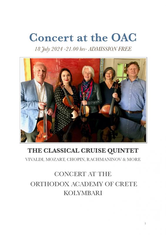 Λέμε συχνά-πυκνά ότι στην Ελλάδα υπάρχουν πολλοί καλοί φίλοι που την αγαπούν και την έχουν σαν δεύτερη πατρίδα τους, αλλά πάντα θα υπάρχουν και οι καλύτεροι. Ανάμεσα σε αυτούς και ο Joost van der Meent με τους δικούς του φίλους από την Ολλανδία που επισκέπτονται κάθε χρόνο την Κρήτη και διαμένουν στα Μεσκλά του Δήμου Πλατανιά. Ο κ. Joost van der Meent με την μουσική παρέα του, την Τετάρτη 18 Ιουλίου και Ώρα 21:00, θα μας χαρίσει μαζί με την αγάπη του στην Κρήτη και μία μουσική βραδυά με κομμάτια από Vivaldi, Mozart, Chopin, Rachmaninov κ.ά.,