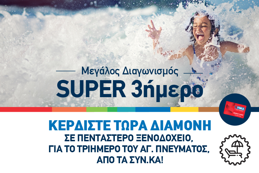 Ένα super χαλαρωτικό τριήμερο του Αγίου Πνεύματος σε τρία πεντάστερα ξενοδοχεία, σε μαγικούς προορισμούς στην Ελλάδα. Όσοι πελάτες των SYN.KA πάρουν μέρος στον διαγωνισμό Super 3ήμερο, μπαίνουν στην κλήρωση για να κερδίσουν δωρεάν διαμονή στο Infinity View στην Τήνο, στο Kontokali Bay Resort & spa στην Κέρκυρα ή στο Daios Hotel στον Άγιο Νικόλαο , στην Κρήτη.