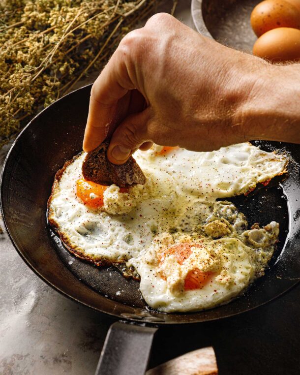 - Με ένα κουτάλι βρέχουμε τους κρόκους με βούτυρο που ολοένα και αυξάνεται στο τηγάνι καθώς λιώνει η στάκα, μέχρι να εμφανίσουν μια λευκή μεμβράνη και τα ασπράδια να σφίξουν. Αν χρειάζεται, σκεπάζουμε το τηγάνι με καπάκι.