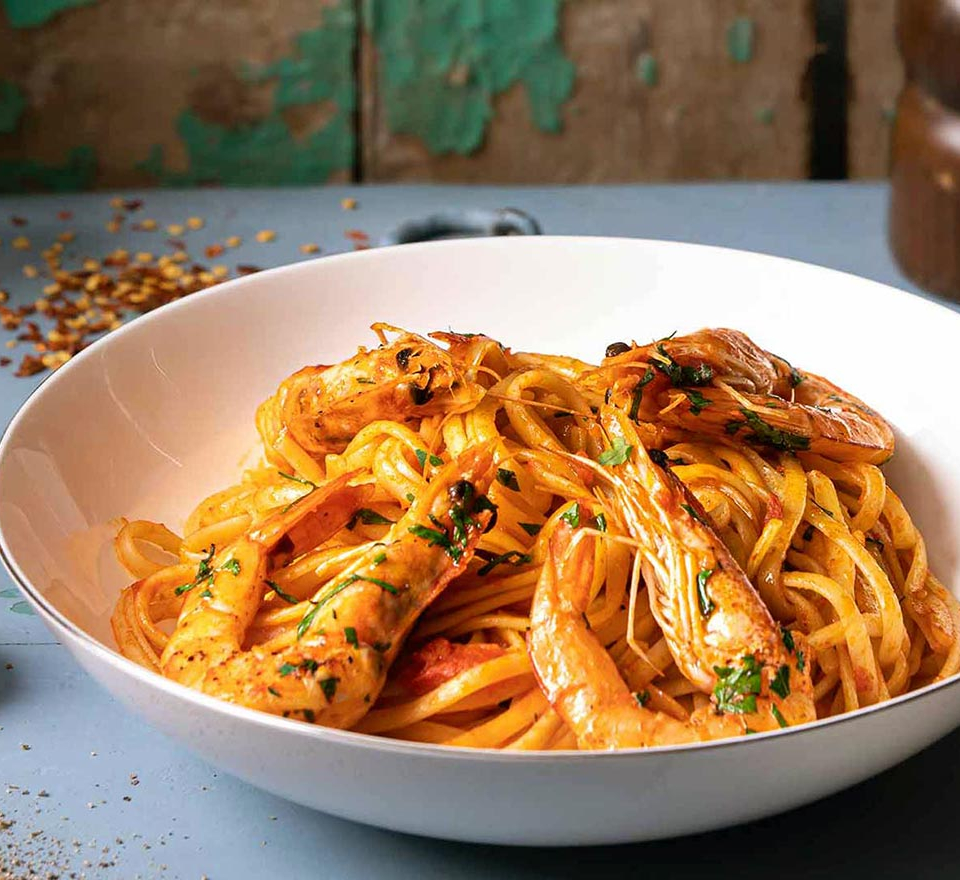 Εκτέλεση: Βράζουμε τις γαρίδες μέχρι να μαλακώσουν. Τις καθαρίζουμε χωρίς όμως να αφαιρέσουμε το κέλυφος. Τσιγαρίζουμε σ’ ένα τηγάνι το λάδι με το σκόρδο και το κρεμμύδι. Προσθέτουμε τις ντομάτες, το αλάτι και το πιπέρι και το αφήνουμε για 5-7 λεπτά. Ρίχνουμε τις γαρίδες και μισό ποτήρι νερό και το αφήνουμε σε χαμηλή φωτιά μέχρι να δέσει η σάλτσα. Εν τω μεταξύ βράζουμε τα μακαρόνια και τα σουρώνουμε βάζοντας αν θέλουμε και λίγο βούτυρο. Μόλις είναι έτοιμη η σάλτσα με τις γαρίδες προσθέτουμε τα μακαρόνια μέσα και ανακατεύουμε. Εμένα μου αρέσει πάρα πολύ να προσθέτω και τριμμένη παρμεζάνα. Δοκιμάστε το! Είναι πολύ γευστικό! Ειδικά εάν είσαι μακαρονάς…