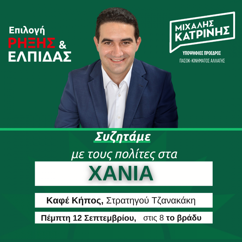 Με το μήνυμα «Συζητάμε με τους πολίτες» ο Μιχάλης Κατρίνης διοργανώνει ανοιχτή συγκέντρωση και συζήτηση με τους πολίτες στις 8.00 το βράδυ στα Χανιά, στο καφέ «Κήπος», Στρατηγού Τζανακάκη.