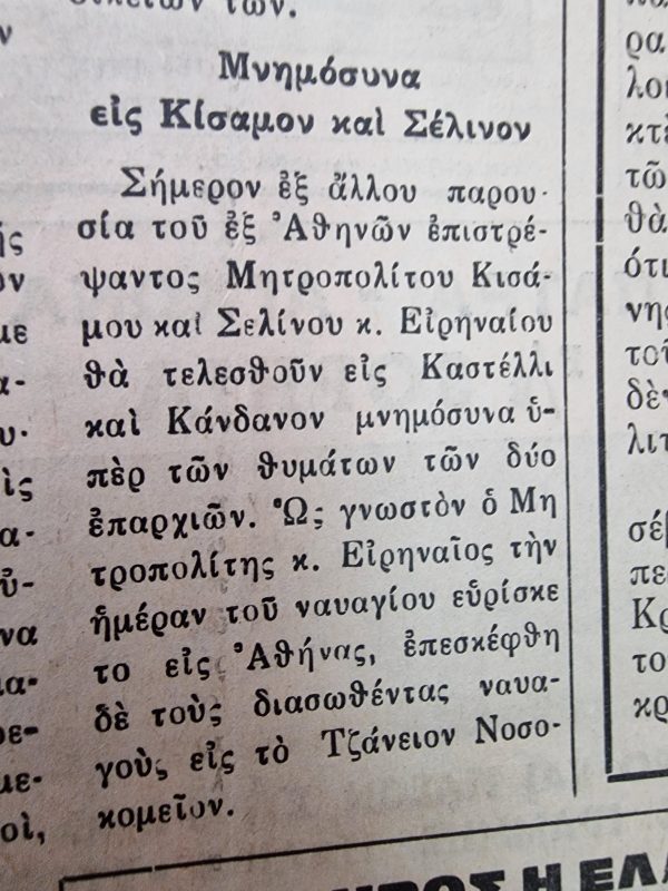 Τους διασωθέντες ναυαγούς του πλοίου “Ηράκλειον” επισκέφθηκε στο Τζάνειο Νοσοκομείο ο Μητροπολίτης Κισάμου & Σελίνου Ειρηναίος Γαλανάκης, σύμφωνα με δημοσίευμα της εποχής.