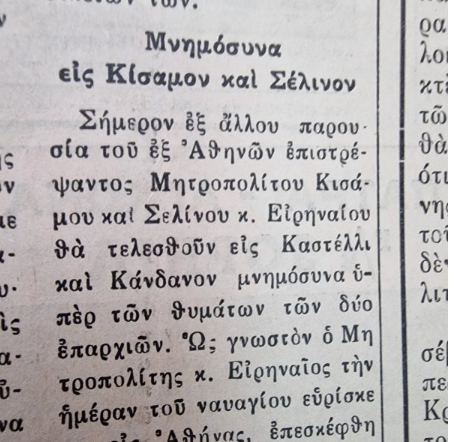 Μετά την επιστροφή του στην Κίσαμο, τέλεσε μνημόσυνο για τα θύματα του ναυαγίου: