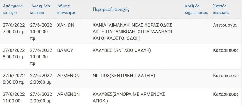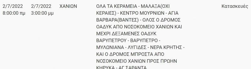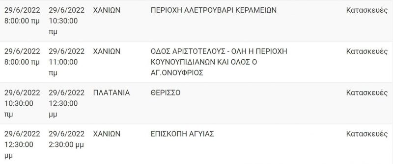 Νομός Χανίων: Διακοπές ρεύματος σε πολλές περιοχές την επόμενη εβδομάδα
