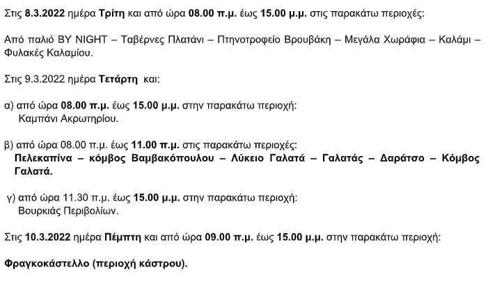 Ειδοποιούνται οι κάτοικοι των παρακάτω περιοχών ότι για να εκτελεστούν απαραίτητες τεχνικές εργασίες στο δίκτυο, θα γίνει διακοπή του ηλεκτρικού ρεύματος:
