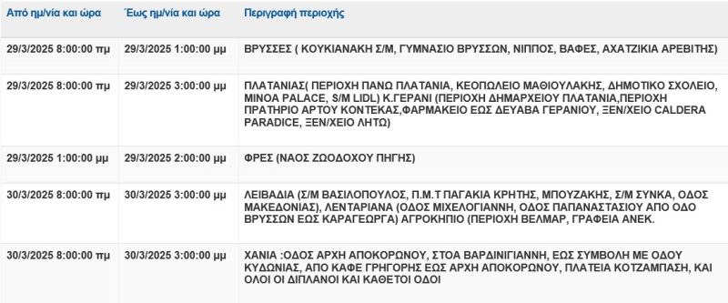 Προγραμματισμένες διακοπές ρεύματος στα Χανιά θα πραγματοποιήσει ο ΔΕΔΗΕ εξαιτίας έργων συντήρησης και επέκτασης του δικτύου του, το Σάββατο 29 και την Κυριακή 30 Μαρτίου.