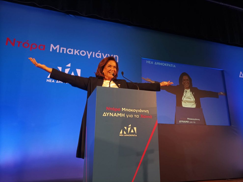 Στο θέατρο “Μίκης Θεοδωράκης” στα Χανιά πραγματοποίησε το βράδυ της Τετάρτης την κεντρική προεκλογική της ομιλία η πρώην υπουργός και υποψήφια βουλευτής Χανίων της ΝΔ Ντόρα Μπακογιάννη. Την υποψήφια βουλευτή Χανίων Ντόρα Μπακογιάννη προλόγισαν τα παιδιά της Αλεξία Μπακογιάννη και Κώστας Μπακογιάννης.