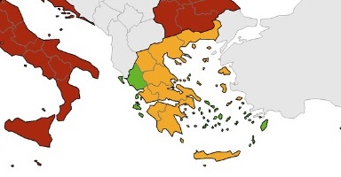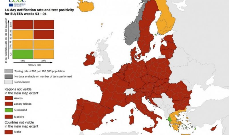 Εκτός από την Ελλάδα, την Φινλανδία και την Ισλανδία, που είναι χρωματισμένες «πορτοκαλί» όλη η υπόλοιπη Ευρώπη βρίσκεται στο «κόκκινο», δηλαδή καταγράφονται πάνω από 150 κρούσματα ανά 100.000 πληθυσμού.