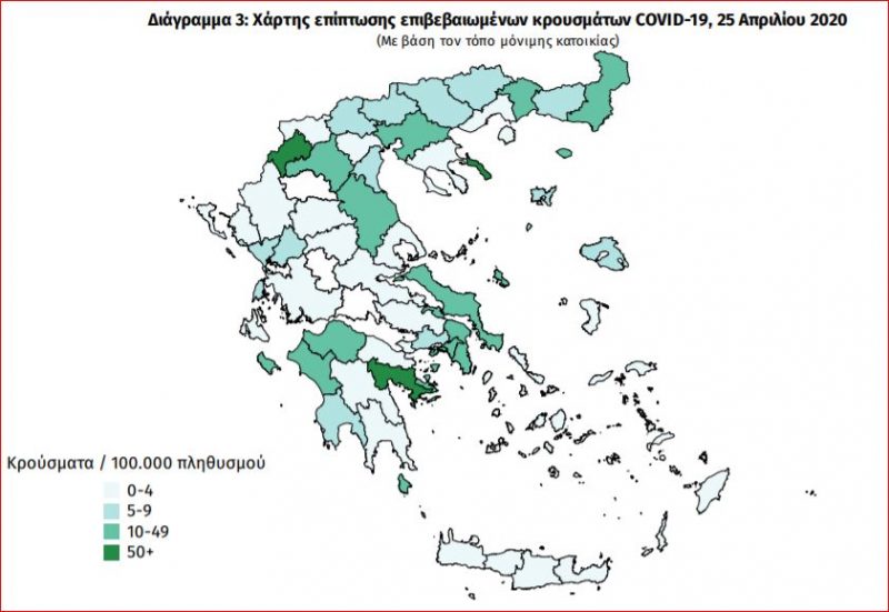 Τη γεωγραφική και ηλικιακή κατανομή του κορωνοϊού στην ελληνική επικράτεια αποτυπώνει ο τελευταίος χάρτης του ΕΟΔΥ, με στοιχεία από την αρχή της επιδημίας έως τις 25 Απριλίου.