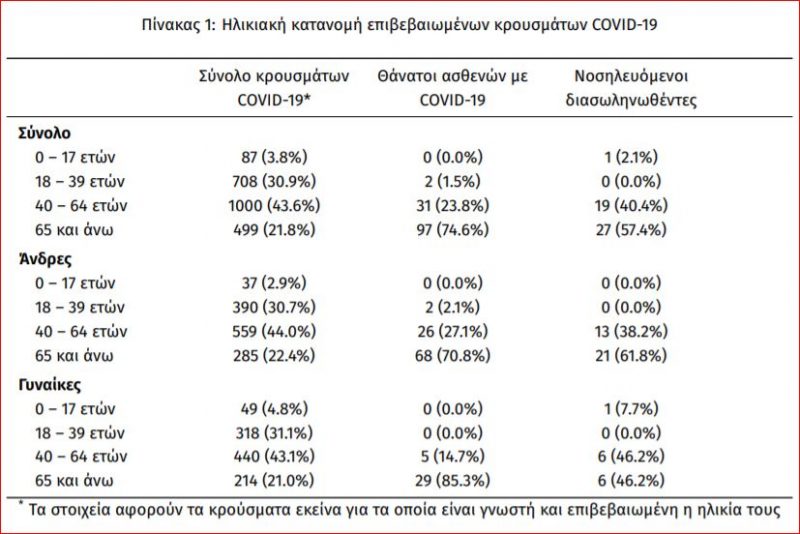 Από το σύνολο των 2506 κρουσμάτων, 578 (23.1%) θεωρούνται σχετιζόμενα με ταξίδι από το εξωτερικό, 1174 (46.8%) είναι σχετιζόμενα με ήδη γνωστό κρούσμα και τα υπόλοιπα δεν σχετίζονται ούτε με ταξίδι ούτε με άλλο γνωστό κρούσμα ή είναι ακόμα υπό διερεύνηση. Η μέση ηλικία των κρουσμάτων είναι 49 έτη (εύρος 0 έως 102 ετών), ενώ η μέση ηλικία των θανάτων είναι 74 έτη (εύρος 35 έως 102 ετών). Η ηλικιακή κατανομή των (α) συνολικών κρουσμάτων, (β) των περιστατικών που κατέληξαν σε θάνατο και (γ) των ασθενών που νοσηλεύονται διασωληνωμένοι, είναι η ακόλουθη: