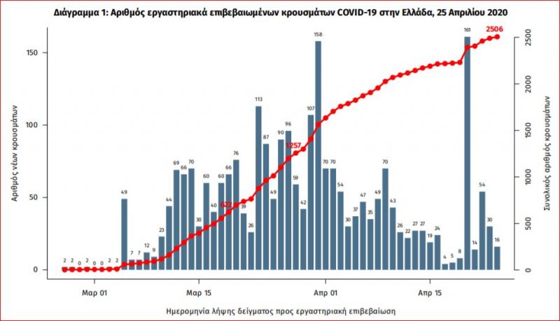 Όπως καταγράφεται στο αντίστοιχο διάγραμμα, ο ρυθμός των κρουσμάτων σημειώνει απότομη αύξηση στις 20 Απριλίου μετά τη διάγνωση 150 κρουσμάτων σε δομή προσφύγων στο Κρανίδι.