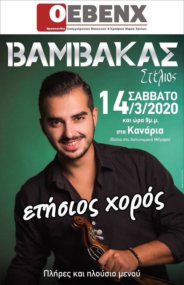 Η Ομοσπονδία Επαγγελματιών, Βιοτεχνών και Εμπόρων Ν. Χανίων μετά από 15 χρόνια διοργανώνει ετήσιο χορό το Σάββατο 14 Μαρτίου 2020 και ώρα 21.00 μμ. στο κέντρο «ΚΑΝΑΡΙΑ» και σας προσκαλεί να μας τιμήσετε με την παρουσία σας.