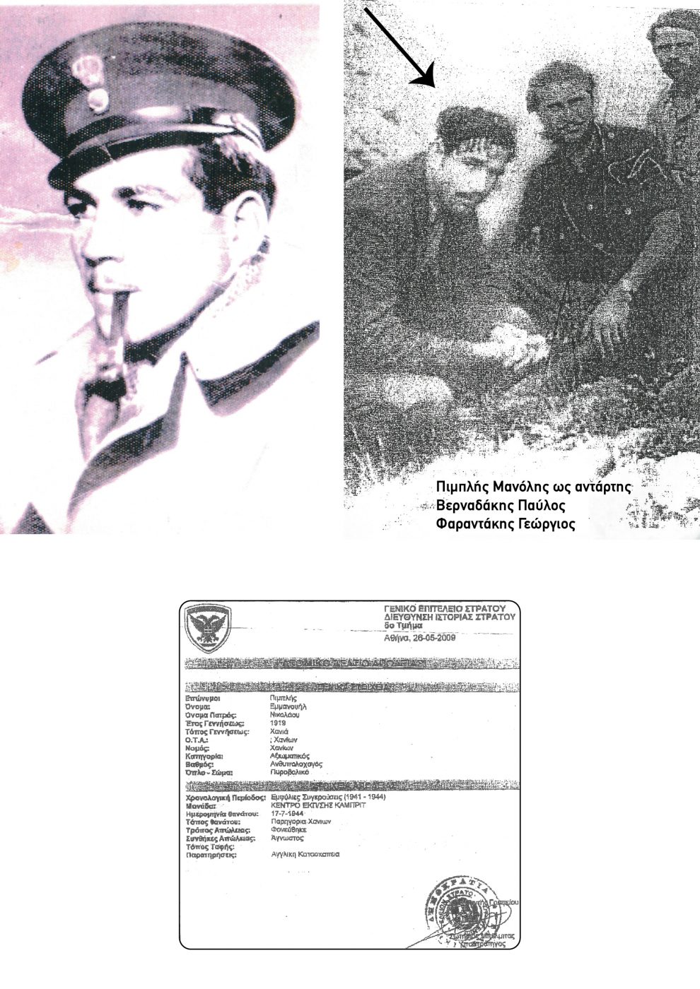 - Την υπ’ αριθμό 29/Δ Ληξιαρχικήπράξη θανάτου του Εμμανουήλ Νικολάου Πιμπλή