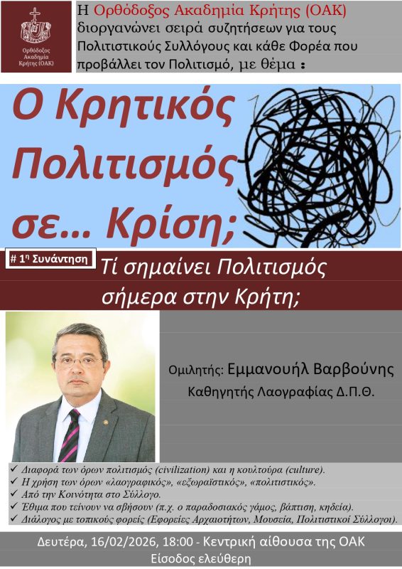 H Ορθόδοξος Ακαδημία Κρήτης (ΟΑΚ) διοργανώνει μία σειρά συζητήσεων, με κεντρικό θέμα: «Ο Κρητικός Πολιτισμός σε… Κρίση;». Παράλληλα, κάνει ανοικτό κάλεσμα προς όλους τους Πολιτιστικούς Συλλόγους και σε κάθε Φορέα που προβάλλει τον Πολιτισμό του τόπου μας, όπως και σε κάθε ιδιώτη που ενδιαφέρεται να συμβάλει στο διάλογο αυτό, τόσο αναγκαίο για το μέλλον της κρητικής παράδοσης.