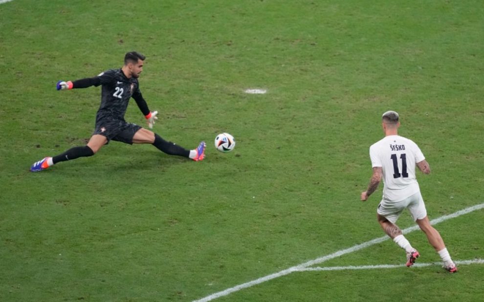 Με το μαχαίρι στα… δόντια μπήκε η Πορτογαλία στο παιχνίδι, έχοντας τον πλήρη έλεγχο και την πρωτοβουλία των κινήσεων. Μπορεί να μην είχε τελική εντός στόχου, αλλά ήταν πιεστική με την Σλοβενία να μην μπορεί να αλλάξει περισσότερες από τρεις πάσες. Έκτοτε οι τυπικά φιλοξενούμενοι έκαναν το παιχνίδι πιο νευρικό και… χάλασαν την δημιουργία της ομάδας του Ρομπέρτο Μαρτίνεθ. Η πρώτη τελική στην εστία για την Πορτογαλία ήρθε στο 30′ με τον Ρονάλντο να παίρνει την κεφαλιά μέσα από την μικρή περιοχή, με τον Όμπλακ όμως να μπλοκάρει σταθερά. Στο 34′ ο Κριστιάνο απείλησε ξανά. Με φάουλ εκτός περιοχής προσπάθησε να κερδίσει τον Σλοβένο κίπερ, με την μπάλα να περνάει ελάχιστα άουτ. Λίγο πριν τη συμπλήρωση του πρώτου ημιχρόνου η Σλοβενία είχε την πρώτη της καλή στιγμή. Ο Σέσκο δοκίμασε τα πόδια του έξω από την περιοχή, αλλά ο Ντιόγκο Κόστα ήταν σε ετοιμότητα. Στην τελευταία φάση για το πρώτο μέρος, ο Παλίνια σούταρε δυνατά με την μπάλα να βρίσκει στο δεξί κάθετο δοκάρι του Όμπλακ.