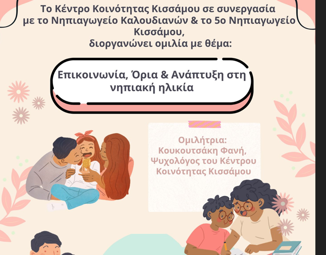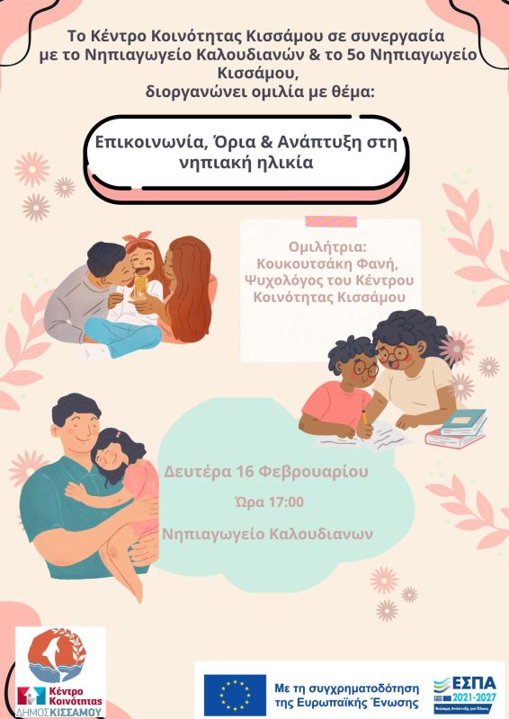 Το Κέντρο Κοινότητας Δήμου Κισάμου σε συνεργασία με το Νηπιαγωγείο Καλουδιανών & το 5ο Νηπιαγωγείο Κισάμου διοργανώνει ομιλία με θέμα: «Επικοινωνία, όρια & ανάπτυξη στη νηπιακή ηλικία».