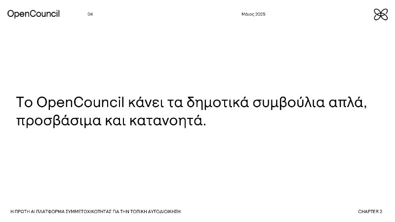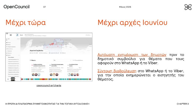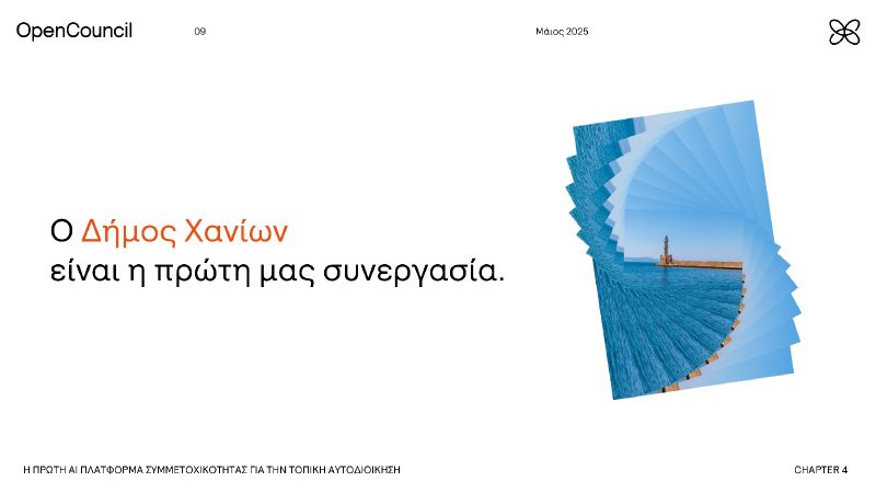 Η πιλοτική λειτουργία του νέου πρωτοποριακού εργαλείου του Δημοτικού Συμβουλίου, της πρώτης AI πλατφόρμας συμμετοχικότητας για την τοπική αυτοδιοίκηση opencouncil.chania.gr παρουσιάστηκε σήμερα στο πλαίσιο Συνέντευξης Τύπου, που παραχωρήθηκε στο Δημαρχείο Χανίων.