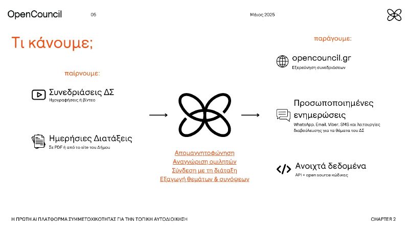 Η AI πλατφόρμα συμμετοχικότητας ΟpenCouncil του Δήμου, χρησιμοποιώντας την τεχνολογία καταγραφής των δημοτικών συμβουλίων παράγει απομαγνητοφωνήσεις κάθε συνεδρίασης δημοτικού συμβουλίου καθώς «αναγνωρίζει» τον ομιλητή από τη φωνή του, οργανώνει τα δημοτικά συμβούλια εξάγοντας αυτόματα θέματα και συνδέοντας τα με την ημερήσια διάταξη ενώ παράγει στατιστικά και φτιάχνει σελίδες παρατάξεων και ομιλητών, δίνοντας την ευκαιρία στον πολίτη να ενημερώνεται για κάθε θέμα και σε οποιαδήποτε περιοχή του Δήμου Χανίων, με την αποστολή σύντομων ενημερώσεων στο WhatsApp/Viber για τα θέματα, που εντάσσονται στην ημερήσια διάταξη μιας συνεδρίασης και αφορούν στη γειτονιά και τον δρόμο, που κατοικεί κάθε δημότης.