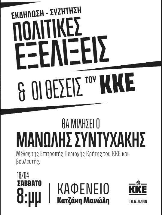 Η Τομεακή Επιτροπή Χανίων του ΚΚΕ, το Σάββατο 16/4, στις 8μ.μ. στο καφενείο του Κατζάκη Μανώλη στα Π. Ρούματα, θα πραγματοποιήσει εκδήλωση-συζήτηση, με θέμα «Οι πολιτικές εξελίξεις και οι θέσεις του ΚΚΕ». Στην εκδήλωση θα μιλήσει ο Μανώλης Συντυχάκης, μέλος της Επιτροπής Περιοχής Κρήτης του ΚΚΕ, Περιφερειακός Σύμβουλος Κρήτης και βουλευτής του Κόμματος.