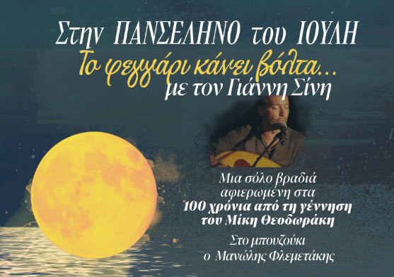 Η Μουσική Βραδιά με τίτλο «Το φεγγάρι κάνει βόλτα», περιλαμβάνει σόλο ερμηνείες του Γιάννη Σίνη, με αγαπημένα τραγούδια του Μίκη Θεοδωράκη, υπό την ατμοσφαιρική συνοδεία του Μανώλη Φλεμετάκη στο μπουζούκι.