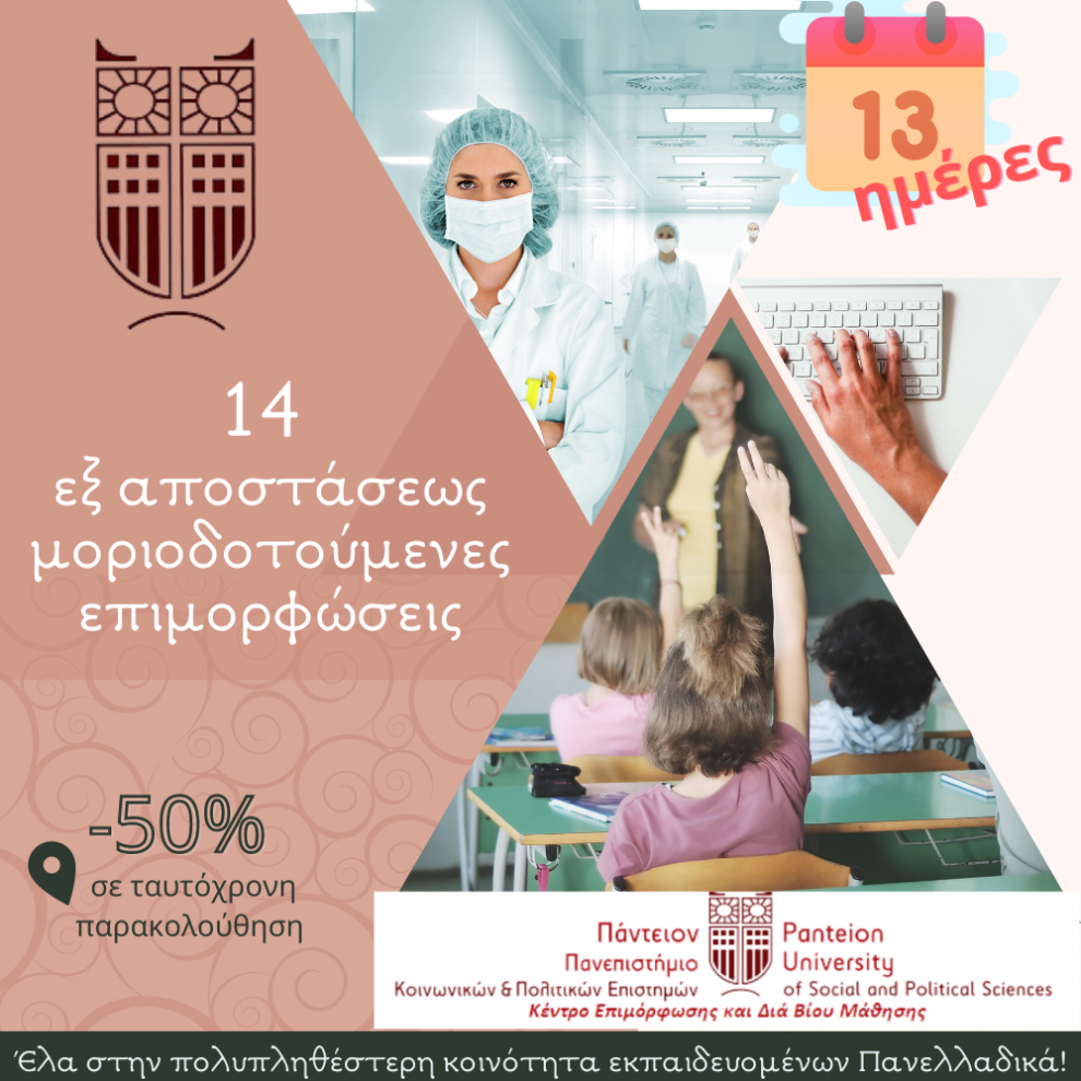 - -50% σε επόμενη επιμόρφωση στα συνεργατικά προγράμματα του Παντείου Πανεπιστημίου Κ.Ε.ΔΙ.ΒΙ.Μ.