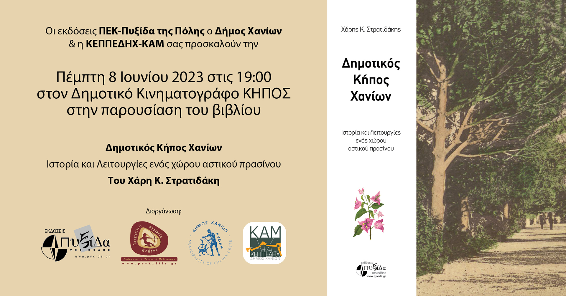 Οι εκδόσεις ΠΕΚ-Πυξίδα της Πόλης και ο Δήμος Χανίων σας προσκαλούν την Πέμπτη 8 Ιουνίου 2023 στις 19:00 στον Δημοτικό Κινηματογράφο ΚΗΠΟΣ στην παρουσίαση του βιβλίου “Δημοτικός Κήπος Χανίων – Ιστορία και Λειτουργίες ενός χώρου αστικού πρασίνου”, του Χάρη Κ. Στρατιδάκη