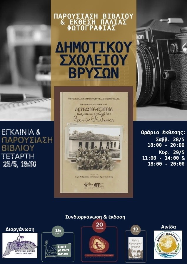 Η Πολιτιστική Εταιρεία Κρήτης και ο Πολιτιστικός και Αναπτυξιακός Σύλλογος «Πέργαμος» σας προσκαλούν στην παρουσίαση του βιβλίου «Αναγνώσεις μιας ιστορικής πηγής, Λεύκωμα – Ιστορία Δημοτικού Σχολείου Βρυσῶν Κυδωνίας» (εκδόσεις Πυξίδα της Πόλης) και στα ταυτόχρονα εγκαίνια πολυμεσικής έκθεσης με θέμα το Δημοτικό Σχολείο Βρυσών Δήμου Πλατανιά.
