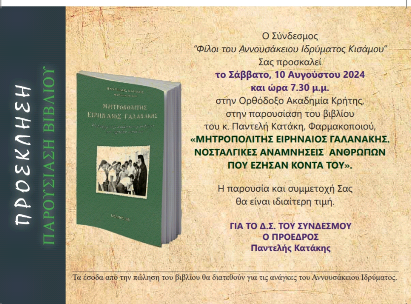 Ο Πρόεδρος των Φίλων του Αννουσάκειου Ιδρύματος, κ. Παντελής Κατάκης, σας προσκαλεί το Σάββατο 10 Αυγούστου στις 6.30 μ.μ. στην Ορθόδοξη Ακαδημία Κρήτης, στην παρουσίαση του βιβλίου για τον Μακαριστό Ειρηναίο με τίτλο: «Μητροπολίτης Ειρηναίος Γαλανάκης – Νοσταλγικές αναμνήσεις ανθρώπων που έζησαν κοντά του», την έκδοση του οποίου επιμελήθηκε ο ίδιος. Τα έσοδα από τις πωλήσεις του βιβλίου θα διατεθούν εξ ολοκλήρου για τις ανάγκες του Αννουσάκειου Ιδρύματος.