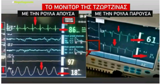 Συγκεκριμένα, στο ντοκουμέντο που δίνει στη δημοσιότητα μέσα από το κεντρικό δελτίο ειδήσεων του MEGA και αποτελεί συρραφή δύο εικόνων, φαίνεται από τη μια το μόνιτορ της Τζωρτζίνας από τη ΜΕΘ υπό την επιτήρηση των γιατρών και χωρίς την παρουσία της Ρούλας Πισπιρίγκου και από την άλλη το μόνιτορ της 9χρονης όταν η μητέρα της βρίσκεται στο δωμάτιο μαζί της.