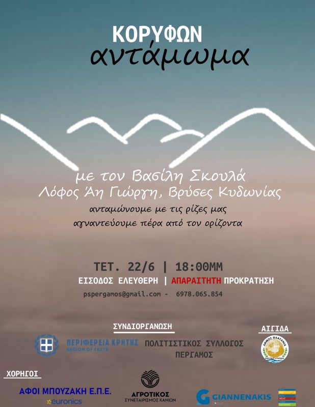 Ο Δήμος Πλατανιά στηρίζει τη συναυλία με τον Βασίλη Σκουλά που διοργανώνει ο Πολιτιστικός και Αναπτυξιακός Σύλλογος Πέργαμος, με την Περιφέρεια Κρήτης, υπό την αιγίδα του Δήμου Πλατανιά, που θα πραγματοποιηθεί την Τετάρτη 22 Ιουνίου και ώρα 18:00, στο λόφο του Αγίου Γεωργίου, στις Βρύσες Κυδωνίας, με αφορμή το θερινό ηλιοστάσιο.
