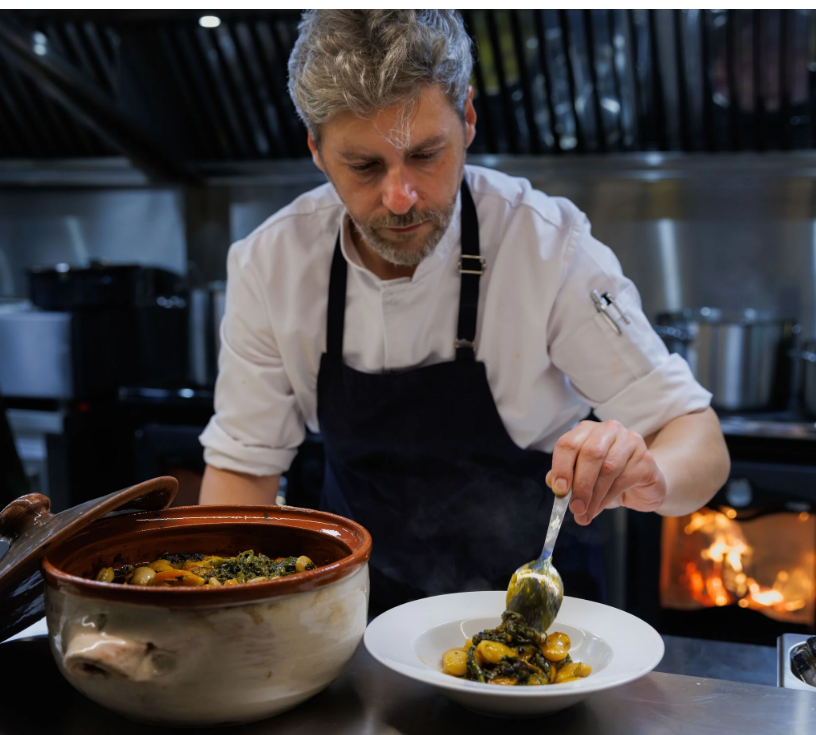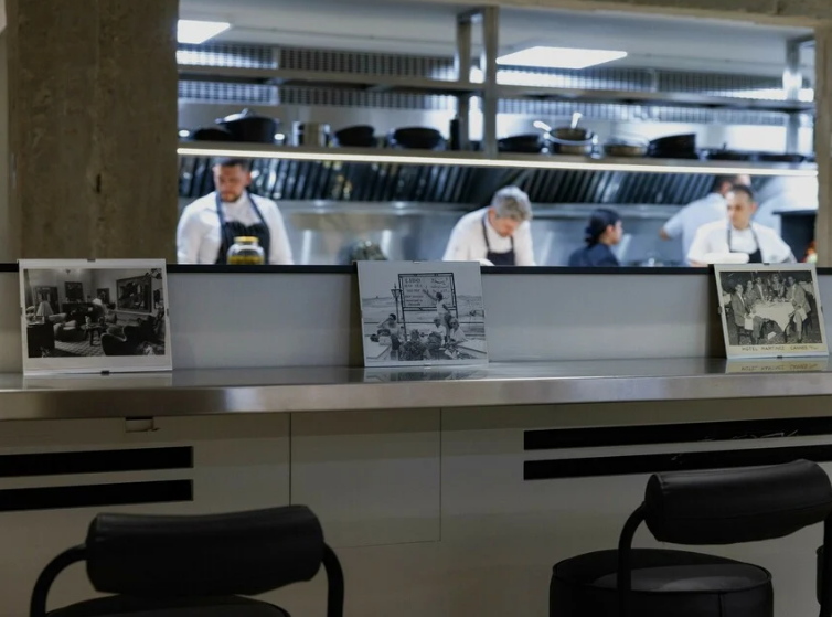 Στην ίδια μπάρα, λίγο πιο πέρα, στην ανοιχτή του κουζίνα ανάβουν φωτιές, και οι θέσεις μπροστά από αυτή λειτουργούν σαν chef’s table. Μόνο που στο συγκεκριμένο, αντί να παρακολουθούμε να στήνονται fine πιάτα με χειρουργικές κινήσεις, βλέπουμε να ανοίγουν γάστρες που έχουν βγει από τον ξυλόφουρνο και μέσα τους κρύβουν γίγαντες με χόρτα.