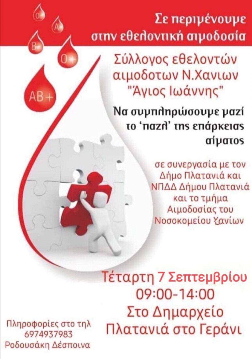Ο Δήμος Πλατανιά, το ΝΠΔΔ Δήμου Πλατανιά, ο Σύλλογος Εθελοντών Αιμοδοτών Νομού Χανίων, ο “Άγιος Ιωάννης” και το Τμήμα Αιμοδοσίας του Γ. Νοσοκομείου Χανίων ο “Άγιος Γεώργιος” θα πραγματοποιήσουν αύριο, Τετάρτη 7 Σεπτεμβρίου 2022, εθελοντική αιμοδοσία στο Δημαρχείο Πλατανιά στο Γεράνι από τις 09:00π.μ.-14:00μ.μ.. Κατά τη διάρκεια της εθελοντικής δράσης θα γίνεται και δειγματοληψία μυελού των οστών.