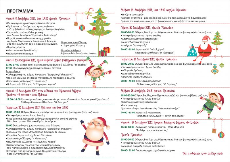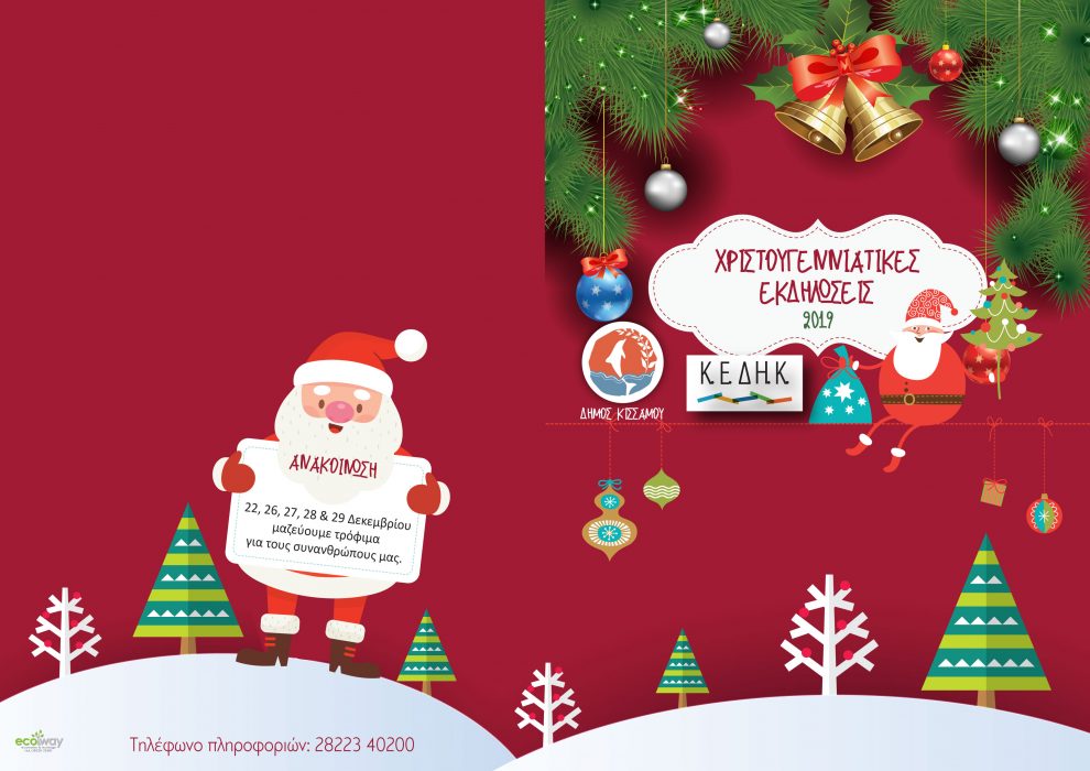 Ο Δήμος Κισάμου και η Κοινωφελής Επιχείρηση του Δήμου Κισάμου σας προσκαλούν στις Χριστουγεννιάτικες εκδηλώσεις που θα ξεκινήσουν την Κυριακή 8 Δεκεμβρίου με τη φωταγώγηση του χριστουγεννιάτικου δέντρου και θα ολοκληρωθούν την Κυριακή  29 Δεκεμβρίου.