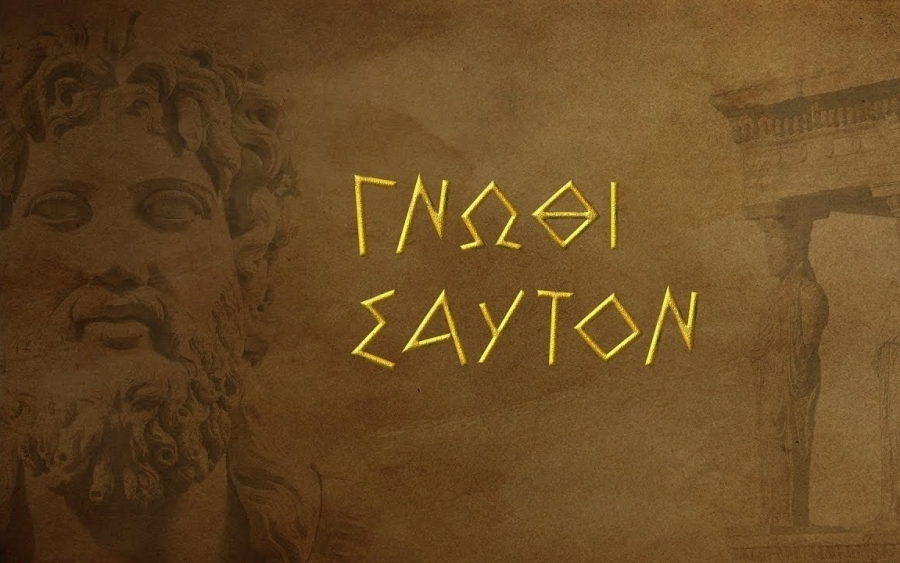 Αποδίδεται στον Χείλωνα τον Λακεδαιμόνιο, έναν από τους επτά σοφούς. Σημαίνει γνώρισε τον εαυτό σου, έχε αυτογνωσία.