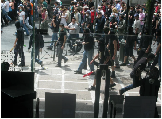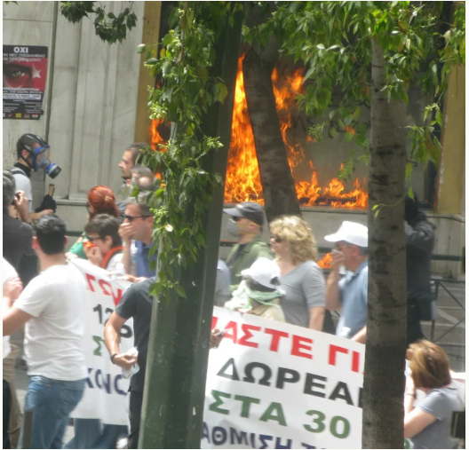 «Ήμουν στην οδό Σταδίου, μαζί με τον Βασίλη Χατζηϊακώβου και βλέπαμε μια συνηθισμένη πορεία – όπως γίνονταν τότε με οργή να περισσεύει και τα συνήθη επεισόδια να ακολουθούν και τράβηξα, όπως έκανα και άλλες φορές, μια σειρά φωτογραφίες, στις 5 Μαΐου 2010, πριν από 15 χρόνια. Οι φωτογραφίες που συνοδεύουν αυτό το σημείωμα τραβήχτηκαν, από το πατάρι του Ιανού που καταφύγαμε να γλυτώσουμε από τα δακρυγόνα και από δημοσιογραφικό αισθητήριο, καθώς είδαμε μια ασυνήθιστη σκηνή να εξελίσσεται στη γωνία Εδουάρδου Λω και Σταδίου.