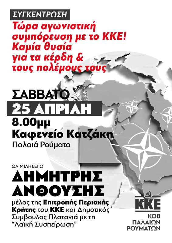 Ομιλητής θα είναι ο Δημήτρης Ανθούσης, μέλος της Επιτροπής Περιοχής Κρήτης του ΚΚΕ και ∆ημοτικός Σύμβουλος Πλατανιά με τη “Λαϊκή Συσπείρωση”.