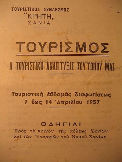 Από τη δεκαετία του 1950 οι φωνές για αξιοποίηση του τουρισμού πλήθυναν όπως προκύπτει από την πλούσια σχετική αρθρογραφία στις τοπικές εφημερίδες. Η Ελληνική Περιηγητική Λέσχη, ίδρυσε παράρτημα στην πόλη των Χανίων το 1952. Την περίοδο εκείνη είχαν ήδη αρχίσει να ξεπηδούν αρκετοί επιχειρηματίες που ασχολούνταν αποκλειστικά με τον τουρισμό, οι οποίοι, έπαιρναν πρωτοβουλίες για να προβάλλουν τον τόπο. Το 1957 διοργανώθηκε στα Χανιά «Τουριστική Εβδομάς Διαφωτίσεως» με ομιλίες από δημόσιους και ιδιωτικούς φορείς. Οι ομιλίες είχαν σκοπό να αφυπνίσουν το λαό ώστε να μεριμνήσει για μικρά καθημερινά πράγματα, όπως πχ. την καθαριότητα της πόλης. Η πρωτοβουλία αυτή φαίνεται να λήφθηκε από τον Γεώργιο Πλυμάκη, ταξιδιωτικό πράκτορα.