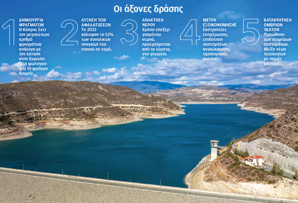 Πρώτο σημείο, είναι ο βασικός στόχος «ούτε μία σταγόνα βροχής να μην καταλήγει στη θάλασσα». «Καθώς είμαστε νησί και δεν υπάρχουν μεγάλες επιφάνειες, τα νερά της βροχής έφταναν εύκολα στη θάλασσα και χάνονταν», εξηγεί ο κ. Αριστείδου. «Γι’ αυτό κατασκευάστηκαν πολλά φράγματα. Σήμερα καλύπτουν το 80% των λεκανών απορροής». Η Κύπρος, με 108 φράγματα, με συνολική χωρητικότητα 332 εκατ. κυβικών μέτρων νερού, είναι η χώρα με τον μεγαλύτερο αριθμό φραγμάτων ανάλογα με την έκταση στην Ευρώπη.