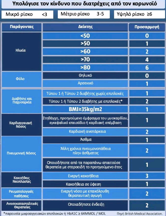 Στον παρακάτω πίνακα παρατίθενται κάποιοι από τους πιο συχνούς παράγοντες κινδύνου για να υπολογίσουμε το σχετικό κίνδυνο που διατρέχουμε». Η διαβάθμιση της επικινδυνότητας (1 για τον μικρό κίνδυνο και 6 για το πιο επικίνδυνο) απεικονίζει ότι στην χειρότερη θέση βρίσκονται τα άτομα άνω των 80 ετών. Ακολουθούν τα άτομα μεταξύ 70-80 ετών και κατόπιν οι πάσχοντες από καρκίνους και λοιπές νεοπλασματικές ασθένειες.