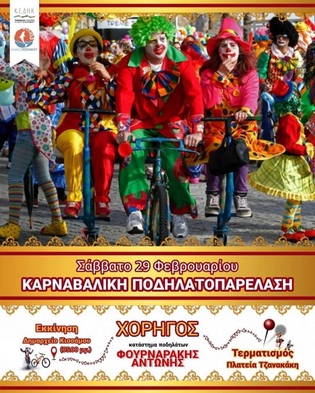 Με Καρναβαλική Ποδηλατοπαρέλαση ανοίγει η αυλαία στις αποκριάτικες εκδηλώσεις του “Κισαμίτικου Καρναβαλιού 2020” το Σάββατο 29 Φεβρουαρίου. Η παρέλαση που θα ξεκινήσει στις 5 μ.μ. από το Δημαρχείο Κισάμου και διασχίζοντας την Ηρώων Πολυτεχνείου θα τερματίσει στην πλατεία Τζανακάκη.