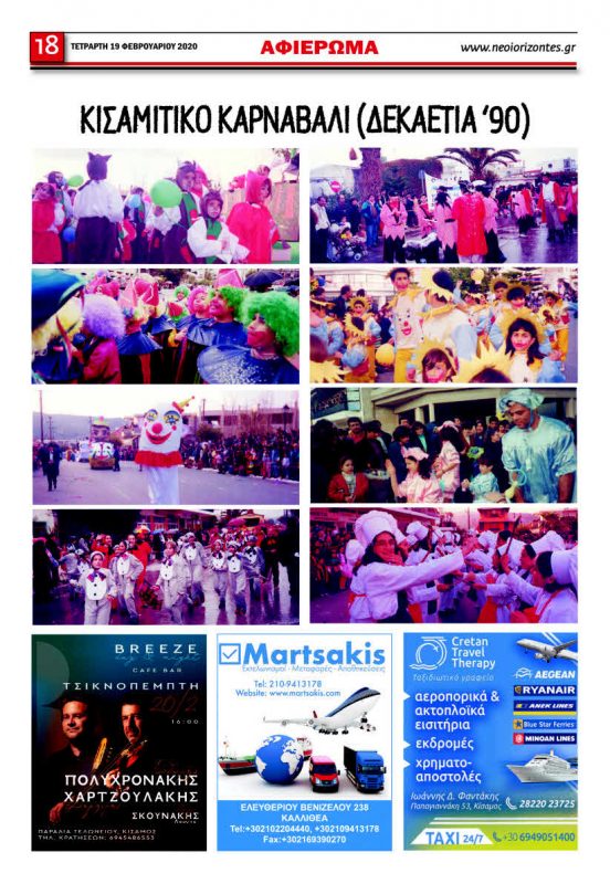 Η εφημερίδα ΝΕΟΙ ΟΡΙΖΟΝΤΕΣ δημοσιεύει στο φύλλο αυτής της εβδομάδας ένα φωτορεπορτάζ από τα πέντε πρώτα Καρναβάλια της Κισάμου, για να μην ξεχνάμε οι παλαιότεροι και να μαθαίνουν οι νεώτεροι.