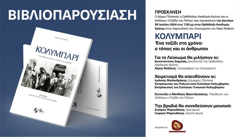 Ο Δήμος Πλατανιά, η Ορθόδοξος Ακαδημία Κρήτης και οι Εκδόσεις «Πυξίδα της Πόλης» σας προσκαλούν την Δευτέρα 29 Ιουλίου 2024 στις 7:30 μμ στην Ορθόδοξο Ακαδημία Κρήτης στην παρουσίαση του Λευκώματος του Χάρη Ναξάκη “ΚΟΛΥΜΠΑΡΙ – Ένα ταξίδι στο χρόνο: ο τόπος και οι άνθρωποι”