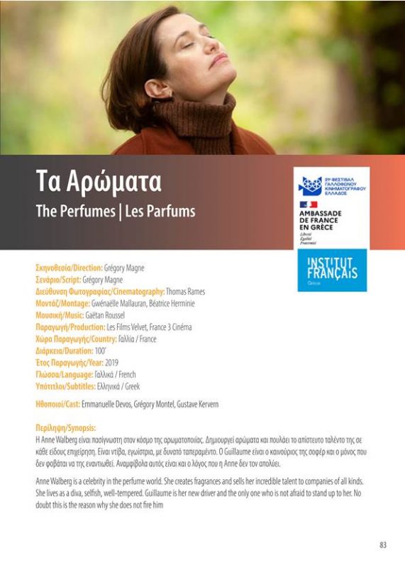 Το 9o Φεστιβάλ Κινηματογράφου Χανίων, το Γαλλικό Ινστιτούτο Αθηνών και το Φεστιβάλ Γαλλόφωνου Κινηματογράφου Ελλάδος παρουσιάζουν την Δευτέρα 25 Οκτωβρίου την ταινία ΤΑ ΑΡΩΜΑΤΑ / Les Parfums του Gregory Magne
