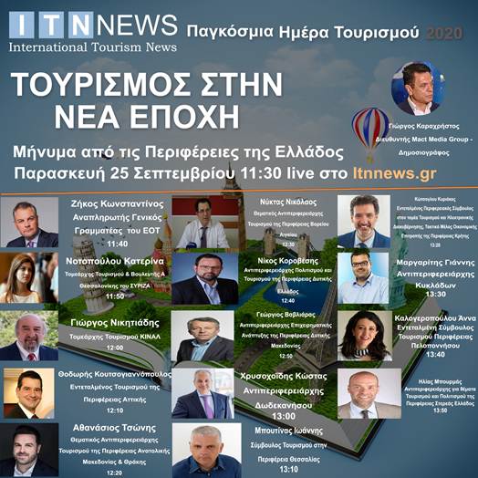 Στις live εκπομπές του itnnews.gr έχουμε την χαρά και την τιμή να σας ανακοινώσουμε ότι την Παρασκευή 25 Σεπτεμβρίου 2020 στις 11:30 θα πραγματοποιηθεί εν όψη της Παγκόσμιας Ημέρας Τουρισμού live εκπομπή (συζήτηση) στην ITNNEWS με θέμα ‘’Τουρισμός στην Νέα Εποχή’’.