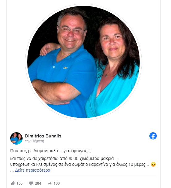 Στην ανάρτησή του η οποία συνοδεύεται από μία φωτογραφία του μαζί με την Διαμαντούλα, ο Δημήτρης Μπούχαλης, καθηγητής που βρίσκεται στην Ινδία, φανερά συγκινημένος περιγράφει τις στιγμές στις οποίες έλεγε στην αδελφή του να εμβολιαστεί αλλά εκείνη το ανέβαλε, καθώς εμφανιζόταν επηρεασμένη από την προπαγάνδα των αντιεμβολιαστών.