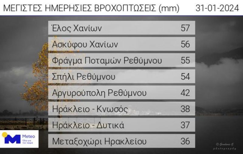 Μεγάλα ύψη βροχής έχουν καταγραφεί και στα Ασκύφου Χανίων (56 χιλιοστά), στο Φράγμα Ποταμών Ρεθύμνου (55 χιλιοστά) και στο Σπήλι Ρεθύμνου (54 χιλιοστά).