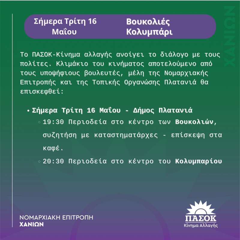 Νομός Χανίων • ΠΟΛΙΤΙΚΗ Σε Βουκολιές και Κολυμπάρι κλιμάκιο της Ν.Ε. ΠΑΣΟΚ Χανίων 16 Μαΐου 2023 12:58 Μοιραστείτε αυτό! Facebook Twitter Google Plus Pinterest LinkedIn Σήμερα Τρίτη 16 Μαΐου κλιμάκιο της Ν.Ε. ΠΑΣΟΚ Χανίων, μαζί με τους υποψήφιους βουλευτές και μέλη της τοπικής οργάνωσης Πλατανιά θα επισκεφτούν: 19:30 Βουκολιές & 20:30 Κολυμπάρι. μπορεί να σου αρέσει επίσης ΚΡΗΤΗ Μεταναστευτικό: Πόσα χρήματα έχουν πάρει Δήμοι στην Κρήτη – Τί γίνεται με τις δομές φιλοξενίας 6 Δεκεμβρίου 2025 ΚΡΗΤΗ Μετά τη σύνταξη… στην Κρήτη: Όλο και περισσότεροι Ευρωπαίοι αγοράζουν σπίτια στο νησί! 6 Δεκεμβρίου 2025 Γεύση - Ψυχαγωγία Taste Atlas: Χάσαμε την πρώτη θέση στις «100 καλύτερες κουζίνες του κόσμου» – Ποια χώρα μας πέρασε 6 Δεκεμβρίου 2025 Χανιά: Φωτιά σε φορτηγό εν κινήσει – Μεγάλη κινητοποίηση της Πυροσβεστικής Εκλογές 2023: Τι ώρα ανοίγουν και τι ώρα κλείνουν οι κάλπες Μοιραστείτε αυτό! Facebook Twitter Google Plus Pinterest LinkedIn ΡΟΗ ΕΙΔΗΣΕΩΝ ΚΡΗΤΗ Μεταναστευτικό: Πόσα χρήματα έχουν πάρει Δήμοι στην Κρήτη – Τί γίνεται με τις δομές φιλοξενίας 6 Δεκεμβρίου 2025 17:06 ΚΡΗΤΗ Μετά τη σύνταξη… στην Κρήτη: Όλο και περισσότεροι Ευρωπαίοι αγοράζουν σπίτια στο νησί! 6 Δεκεμβρίου 2025 17:00 Γεύση - Ψυχαγωγία Taste Atlas: Χάσαμε την πρώτη θέση στις «100 καλύτερες κουζίνες του κόσμου» – Ποια χώρα μας πέρασε 6 Δεκεμβρίου 2025 16:47 ΝΕΟΙ ΟΡΙΖΟΝΤΕΣ • Νομός Χανίων Χανιά: Έφυγε από τη ζωή μετά από θανατηφόρο δυστύχημα αθλητής σε αναπηρικό αμαξίδιο 6 Δεκεμβρίου 2025 09:58 ΕΝΔΙΑΦΕΡΟΝΤΑ Τα ζώδια του Σαββάτου 6 Δεκεμβρίου 6 Δεκεμβρίου 2025 09:41 ΝΕΟΙ ΟΡΙΖΟΝΤΕΣ • Νομός Χανίων Χανιά: Σεισμική δόνηση το βράδυ της Παρασκευής 6 Δεκεμβρίου 2025 09:34 ΕΝΔΙΑΦΕΡΟΝΤΑ Ποιος συμβολισμός κρύβεται πίσω από το «Χριστουγεννιάτικο καράβι» 6 Δεκεμβρίου 2025 07:33 ΚΡΗΤΗ Κρήτη: Ο καιρός σήμερα Σάββατο 6 Δεκεμβρίου 6 Δεκεμβρίου 2025 07:30 ΑΘΛΗΤΙΚΑ Γ’ Εθνική: Με Χαϊδάρι εκτός έδρας ο Γρανίτης – Το πρόγραμμα της αγωνιστικής 6 Δεκεμβρίου 2025 07:27 ΑΘΛΗΤΙΚΑ Super League 2: Στην Καλλιθέα τα Χανιά – Το πρόγραμμα του Σαββατοκύριακου 6 Δεκεμβρίου 2025 07:24 ΑΘΛΗΤΙΚΑ Super League: To πρόγραμμα των αγώνων του Σαββατοκύριακου 6 Δεκεμβρίου 2025 07:16 ΑΘΛΗΤΙΚΑ Τοπικό Χανίων: Οι αγώνες του Σαββατοκύριακου και στις τρεις Κατηγορίες 6 Δεκεμβρίου 2025 07:12 Γεύση - Ψυχαγωγία Συνταγή: Κοτόπιτα µε μανιτάρια (4 μερίδες) 6 Δεκεμβρίου 2025 07:03 Γεύση - Ψυχαγωγία Το ανέκδοτο τoυ Σαββάτου 6 Δεκεμβρίου 2025 07:00 ΕΝΔΙΑΦΕΡΟΝΤΑ Ποιοι γιορτάζουν σήμερα Σάββατο 6 Δεκεμβρίου 6 Δεκεμβρίου 2025 06:54 Δημοφιλή αυτή την εβδομάδα